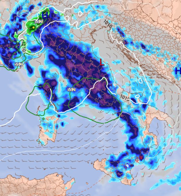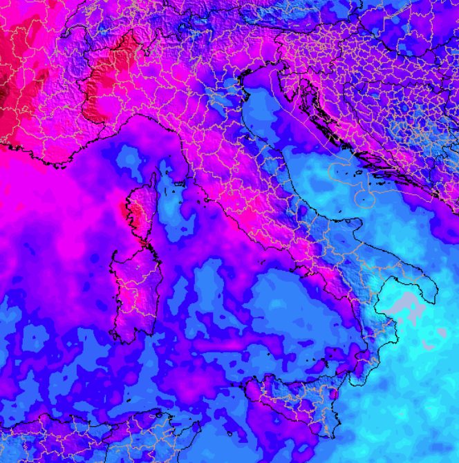 Tra giovedì 2 e venerdì 3 altri impulsi giungeranno da ovest ad alimentare la circolazione depressionaria che andrà instaurandosi, mantenendo attive le condizioni perturbate, tanto che la sommatoria dei fenomeni proposta dal modello europeo fino a sabato 4 maggio è la seguente: (in fucsia gli accumuli più consistenti, che riguarderanno ancora una volta maggiormente nord-ovest e Tirreno):