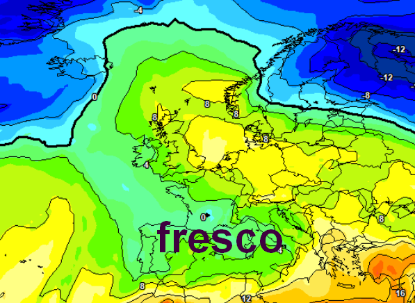 Le temperature comunque tra il 2 e il 3 torneranno al di sotto delle medie del periodo, in particolare sui versanti occidentali, come mostra questa mappa a 1500m tratta dal modello europeo a scala generale: