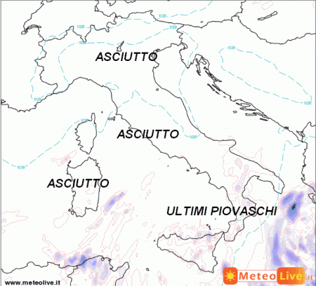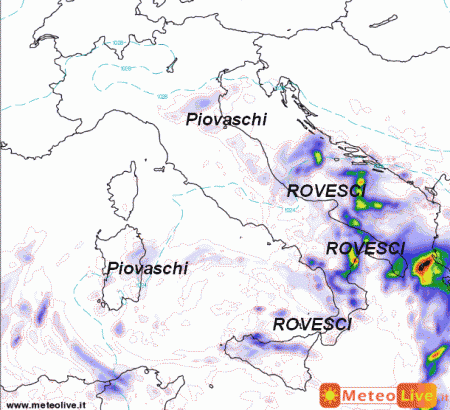 Ecco gli acquazzoni o brevi temporali che ancora insisteranno su Abruzzo, Molise e qua e la al meridione, specie tra la Puglia, la Calabria e il Golfo di Taranto. Qualche piovasco in via di attenuazione ancora sulla Sardegna e la Romagna, per il resto tempo asciutto e largamente soleggiato.