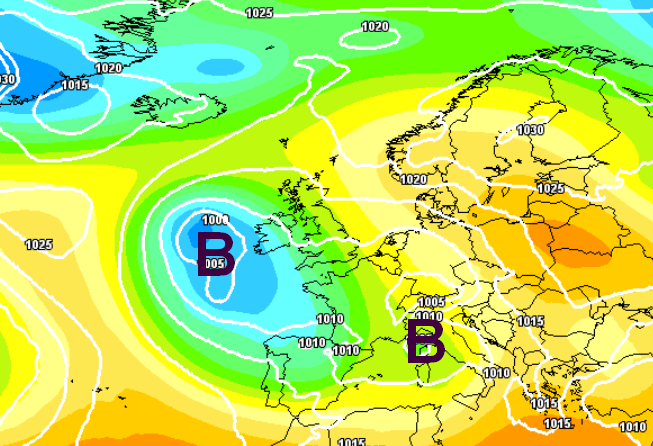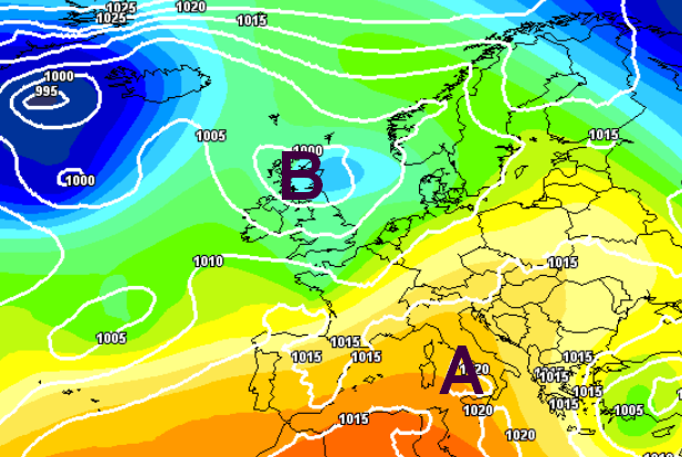 Da lunedì 6 nuovo indebolimento dell’anticiclone e graduale inserimento di correnti instabili e addirittura si profila una nuova imboscata da nord-est con un nuovo vortice freddo ad infilarsi sul Mediterraneo centrale, dando vita ad una nuova fase di maltempo tra il 7 e il 9 maggio, come si evince da questa mappa: