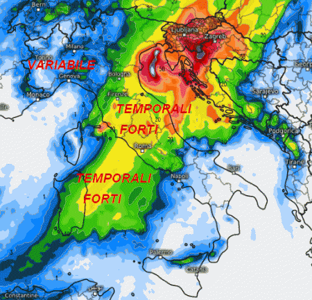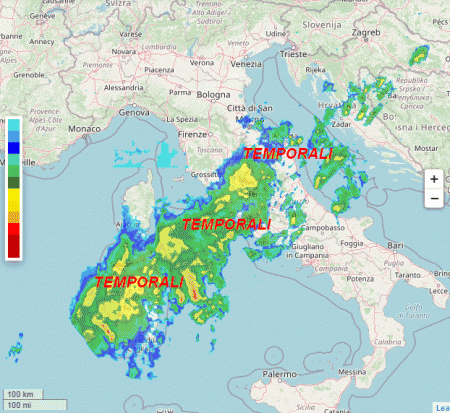 Si nota una schiera di temporali che martellerà per l’intera giornata la Sardegna e le aree del centro Italia, al limite fino alla Campania. In queste aree sono attesi temporali anche molto intensi con annessi nubifragi e grandinate.