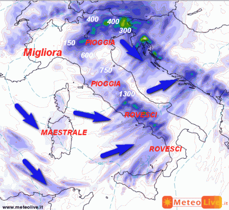 Il sistema frontale si avvita attorno ad una depressione che si è scavata sul Mar Ligure. Questa rallenta il normale moto del fronte da ovest verso est e fa quindi persistere maggiormente i fenomeni sulla nostra Penisola.