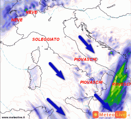 Tempo molto instabile e al centro e al sud, specie lungo il Tirreno, le aree interne, la Campania, la Calabria Tirrenica e la Sicilia settentrionale con rovesci e temporali. Neve oltre i 750 metri sull’Appennino settentrionale, 1300 metri su quello centrale, oltre i 1500 metri al sud. Maestrale forte sulla Sardegna con mari in cattive condizioni. Temperature in generale calo su tutta l’Italia.