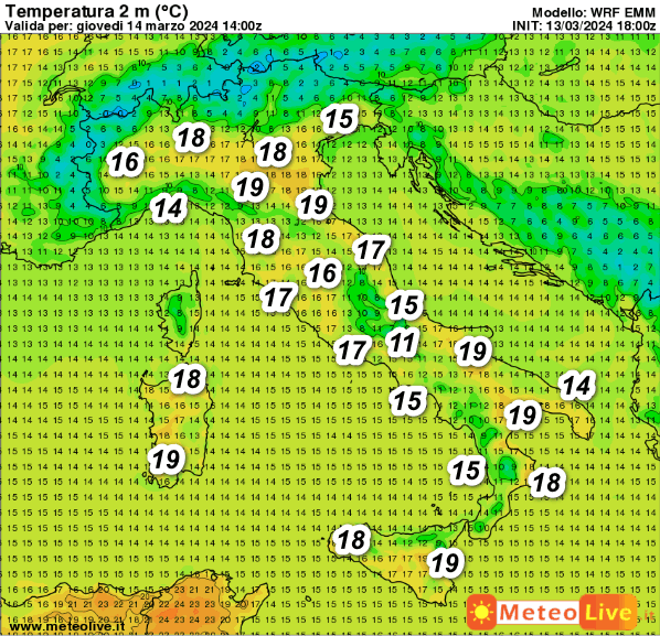 Sul fronte delle temperature, questi sono i valori attesi in Italia alle ore 15 di oggi pomeriggio: