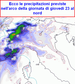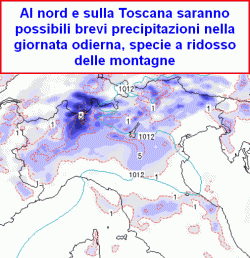 Maltempo ridimensionato ma nel complesso confermato tra oggi e venerdì mattina al nord, qualche pioggia possibile anche su alto e medio Tirreno, Sardegna compresa. Altrove asciutto e mite. Sabato nuovamente instabile su nord-ovest, Sardegna e Toscana, tra domenica e lunedì sempre da valutare la traiettoria di una massa d'aria piuttosto fredda in rientro da est.