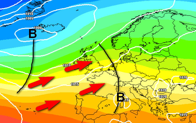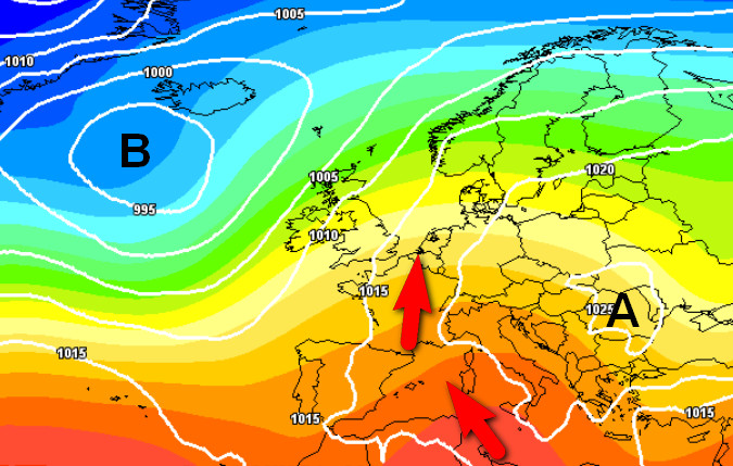 Sulla sinistra dell’immagine notiamo invece un complesso sistema depressionario che lentamente si avvicinerà all’Italia, erodendo la campana stabilizzante dell’alta pressione. In altre parole, la fase di bel tempo non dovrebbe durare a lungo, in quanto nuovamente incalzata dalle correnti atlantiche miti e umide.