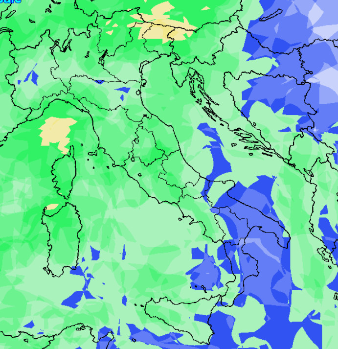 Quasi tutta l’Italia verrà abbracciata da una probabilità di pioggia MEDIA, addirittura MEDIO-ALTA dove vedete il colore giallo, a testimoniare l’ingerenza del flusso atlantico che porterà il suo messaggio umido verso l’Italia. La probabilità di pioggia resterà più BASSA solo sulle estreme regioni meridionali peninsulari.