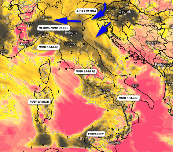 Sulle pianure del nord nebbia al mattino e nubi basse nel pomeriggio. Sul resto d’Italia condizioni di variabilità con qualche pioggia solo all’estremo sud, altrove assenza di fenomeni.