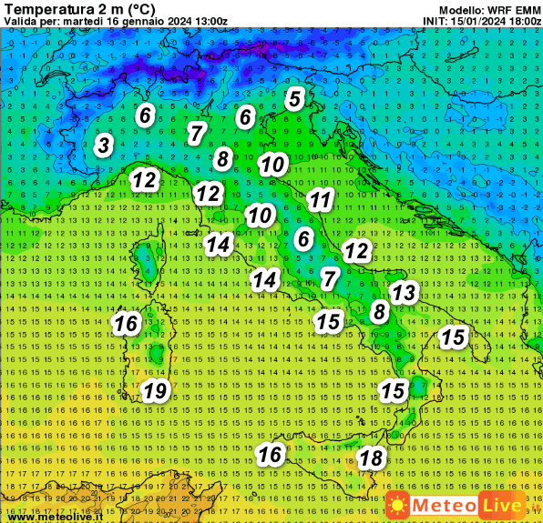 Sul fronte termico, queste sono le temperature attese in Italia alle ore 14 della giornata odierna, martedi 16 gennaio: