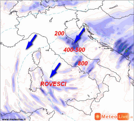 Rovesci anche sulla Sardegna, mentre al nord clima più freddo e secco senza ulteriori fenomeni. Temperature in calo ovunque e rotazione delle correnti dai quadranti settentrionali.