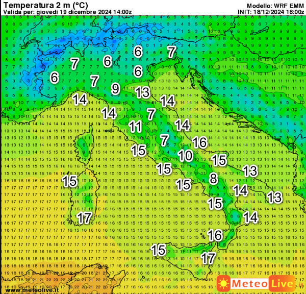 Temperature in calo solo sulle pianure dell’Italia settentrionale dove avremo valori quasi ovunque sotto i 10°. Sul resto d’Italia temperature nel complesso miti con punte di 17° sulle due Isole Maggiori.