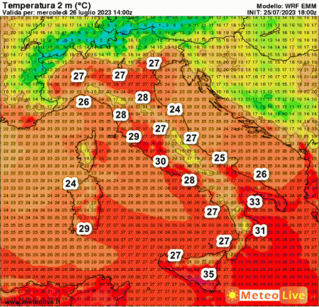 Valori nel complesso gradevoli ed accompagnati da bassi tassi di umidità. Punte di 35° saranno probabili solo sulla Sicilia meridionale e 33° sul Golfo di Taranto.