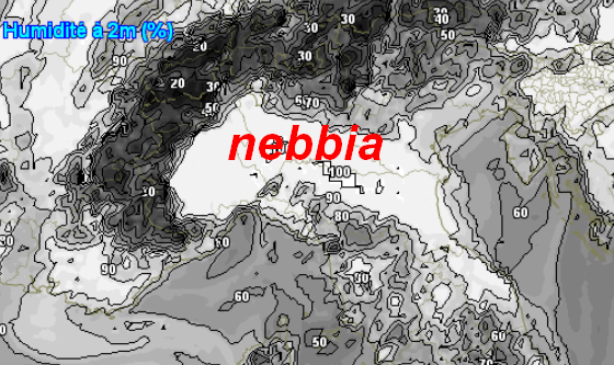 Tra venerdì ed il fine settimana il settentrione sarà interessato da nebbie sulle zone pianeggianti, che manterranno le temperature su valori prossimi allo zero per gran parte della giornata nelle aree coinvolte dal fenomeno, come mostra questa mappa relativa alla percentuale di umidità relativa prevista (in bianco sarà prossima al 100%):