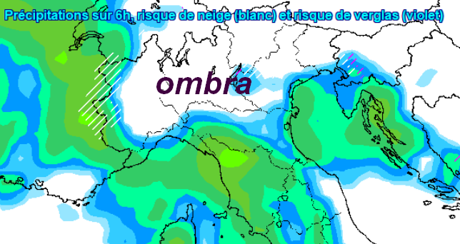 Potenzialmente ci sarebbe ancora la possibilità di vedere neve anche a bassa quota se la successiva umidificazione indotta dalle miti correnti atlantiche intervenisse rapidamente e con le correnti giuste, cioè almeno da sud ovest, ma il flusso sarà eccessivamente occidentale, senza troppe ondulazioni e dunque tutta l’umidità si scaricherà sulle Alpi francesi e la pioggia raggiungerà le aree non schermate dalle Alpi, dunque la Toscana, lasciando in ombra il catino padano che, nel frattempo, perderà anche le condizioni ideali per ospitare le nevicate. Dunque si tratterebbe di un’altra occasione persa e al momento, su questo, non ci sono molti dubbi. Lo vedete qui (notate l’ombra pluviometrica in Valpadana):