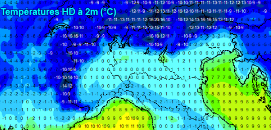 Ecco le temperature previste alle 10 del mattino di sabato 13 gennaio al suolo, come vedete ci sono ancora valori vicino allo zero su molte zone del nord, segnatamente nelle aree coinvolte dalla nebbia: