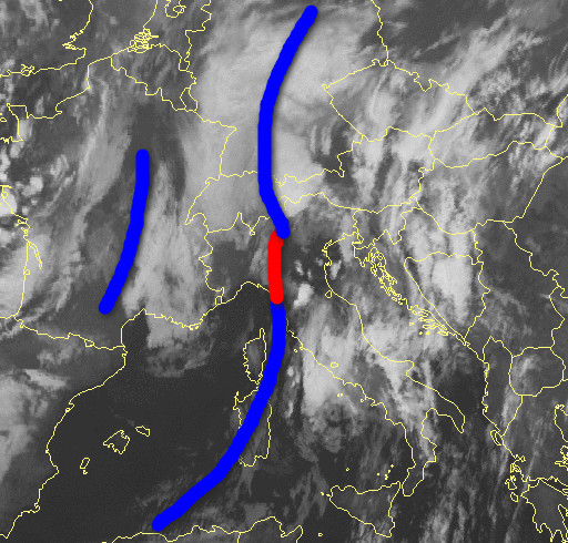 Abbiamo segnato indicativamente la posizione del fronte freddo che sta interessando la nostra Penisola. Sta determinando situazioni temporalesche sia al nord che sulla Toscana, mentre sul resto della Penisola si mantiene attivo un forte richiamo di correnti meridionali molto miti.