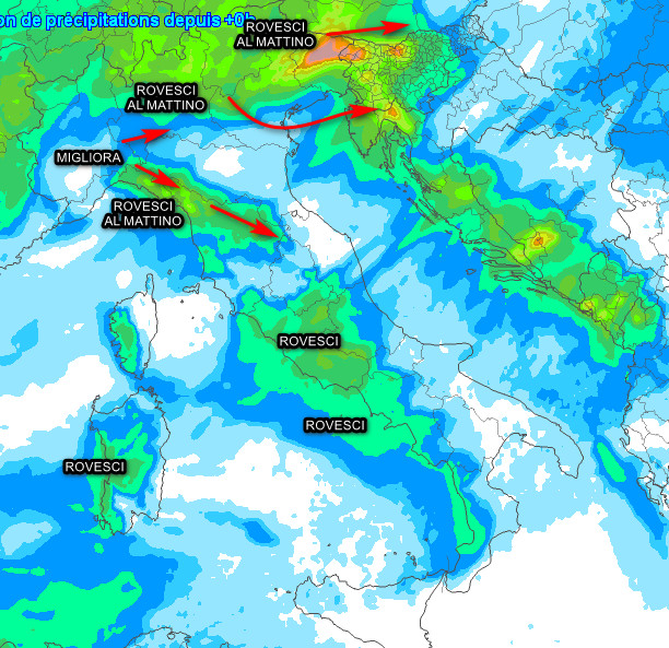 Situazione molto evolutiva: al mattino ancora rovesci e qualche temporale su Appennino Ligure, alta Toscana, fascia prealpina ed alta pianura centro-orientale, con quota neve oltre i 1200-1400 metri. In questi settori la situazione tenderà a migliorare già in tarda mattinata e nel pomeriggio avremo un miglioramento più netto da ovest verso est. Rovesci a metà giornata interesseranno la Sardegna, il Lazio, Umbria, Campania e Calabria Tirrenica. Su tutte le altre regioni tempo asciutto. Attenzione ai venti forti tra ovest e sud-ovest con i bacini centro-settentrionali in cattive condizioni.