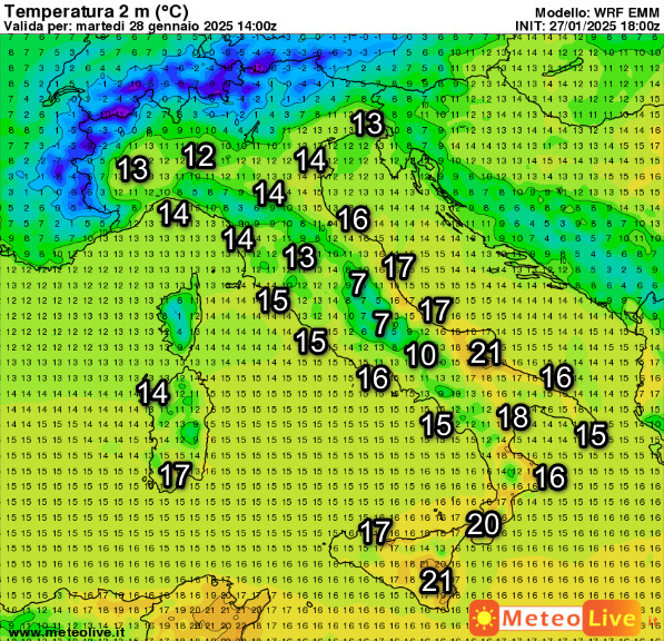 Passiamo adesso alle temperature previste alle ore 15 di martedi 28 gennaio: