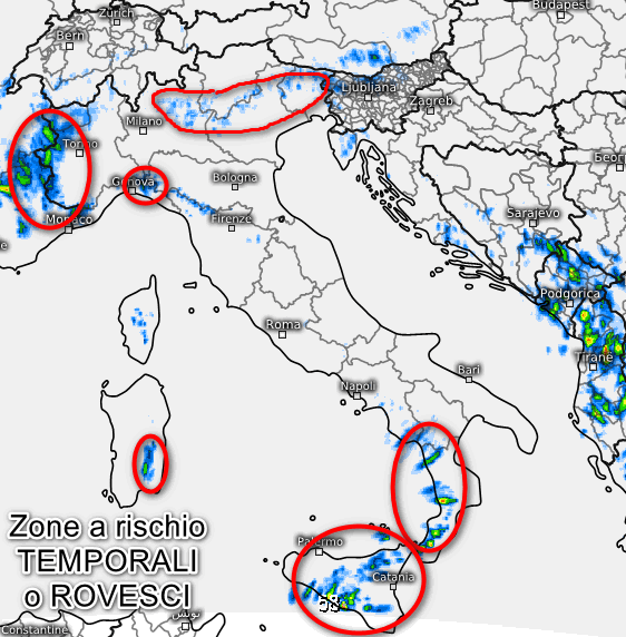 Temporali su alto Piemonte, alta Lombardia, alto Veneto, Alpi occidentali, Marittime, Appennino Ligure con rischio di sconfinamenti in costa. Temporali anche su Appennino Tosco-Emiliano, zone interne poste tra Lazio e Abruzzo oltre al sud della Calabria. Temperature in calo sotto le eventuali situazioni temporalesche, pressochè stazionarie altrove.