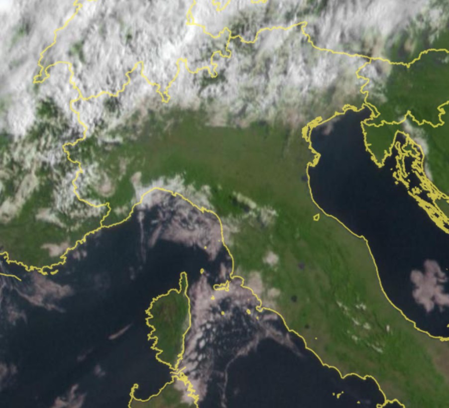 Nell’immagine del satellite vediamo una nuvolosità per il momento innocua che interessa Alpi e Prealpi e alcune aree della Liguria e della Toscana, con qualche debole rovescio in montagna solo fra Valle d’Aosta e alto Piemonte.