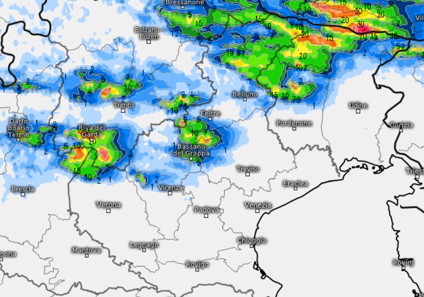 Temporali, per lo più isolati, più probabili nelle zone di Bassano del Grappa, Riva del Garda, Feltre, alto Bellunese, zona Trento. Su tutte le altre zone i temporali saranno molto meno probabili, soprattutto su basso Veneto.