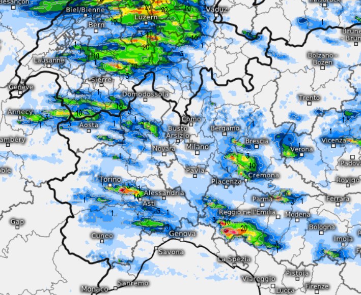 TEMPORALI (spesso brevi e isolati) su Alpi Marittime (possibile sconfinamento verso Savonese e Genovese), Alpi Occidentali (con sconfinamenti in pianura fra Torinese, Cuneese e Astigiano), Biellese, basso Verbano, alta Lombardia (specie Bresciano). Possibili brevi rovesci di pioggia in serata o tarda serata su bassa Lombardia (35%).