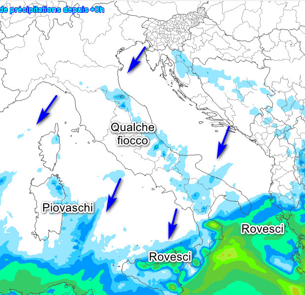 Ancora venti forti da nord-est ed un po' di maltempo sui settori adriatici e al meridione con qualche fenomeno nevoso anche a quote molto basse.