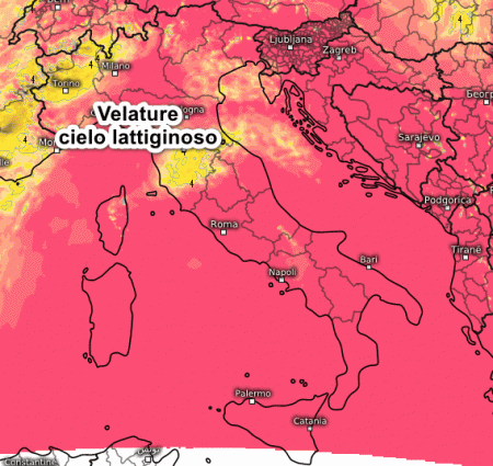 Al nord e sulla Toscana cieli spesso lattiginosi con passaggio di velature o nubi alte, addensamenti più intensi sulle Alpi occidentali, ma con basso rischio di pioggia. Su tutte le altre regioni gran sole.