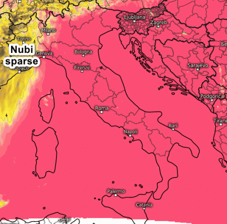 Nubi sparse sull’estremo nord-ovest e sulle Alpi, senza precipitazioni, gran sole altrove.