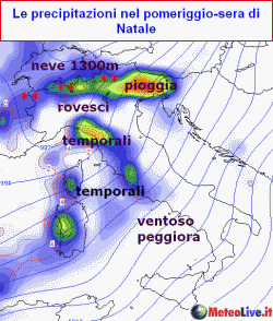 NATALE: forte vento su gran parte del Paese, temporali sulla Liguria, parziale ombra pluviometrica sulla Valpadana, specie sulla bassa e sull’Emilia (che resterà sottovento), forti nevicate sulle Alpi oltre i 1200-1500m, ma verso sera anche sotto i 1000m a partire da ovest. Piogge e temporali anche sulle regioni centrali tirreniche, ventoso altrove con schiarite.