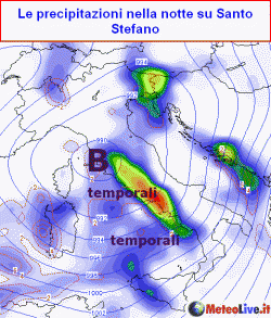 MALTEMPO NATALIZIO: confermato su tutta l’Italia a partire dal settentrione con tanto vento, pioggia, temporali e anche molta neve sulle Alpi, dapprima a quote medie, poi anche sotto i 1000m con temperature in calo. Maltempo, vento e temporali anche al centro-sud, soprattutto a Santo Stefano con anche qualche spruzzata di neve in Appennino.