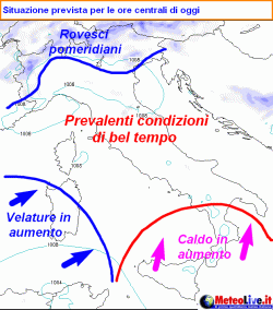 Il nord e il centro permarranno sotto l'influsso di una circolazione depressionaria che recherà comunque ancora fenomeni essenzialmente al nord. All'estremo sud sventagliata calda tra oggi sabato, specie in Sicilia e Calabria.