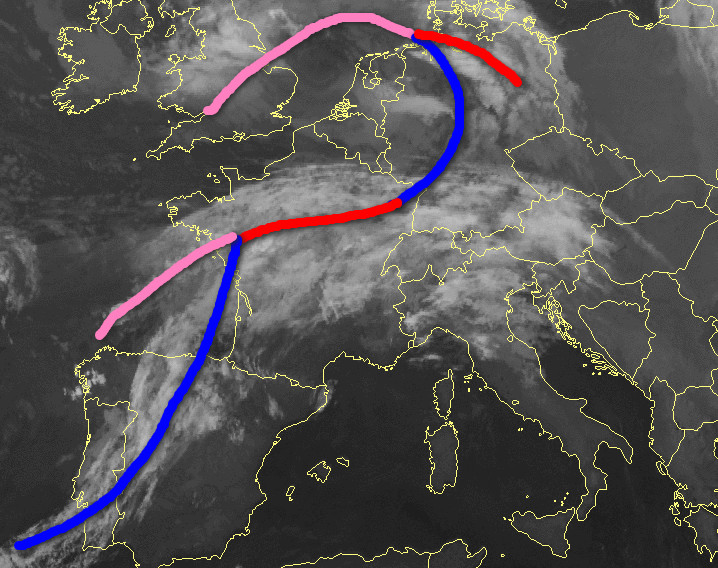 Il treno delle perturbazioni atlantiche scorre ancora a nord delle Alpi, lambendo il settentrione, ma con fenomeni poco importanti. Facciamo attenzione al fronte freddo (linea blu) che si nota sulla Penisola Iberica. Durante la prossima notte si addosserà all’arco alpino occidentale per poi dare luogo ad un peggioramento su parte del centro-nord nella giornata di domani.
