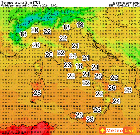 Valori nel complesso gradevoli su quasi tutta l’Italia. Un po’ caldo sulle Isole con punte di 28-29°.