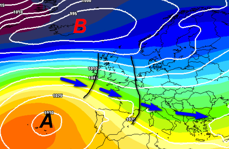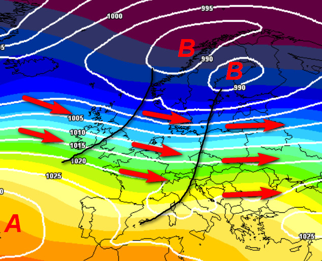 Correnti veloci da ovest interesseranno il nostro Continente ed in parte anche l’Italia. Si tratterà di aria nel complesso mite, ma abbastanza umida che sulla nostra Penisola darà luogo anche a precipitazioni. Osservate l’alta pressione che si posizionerà di spalla sul vicino Atlantico, facilitando lo scivolo di queste correnti verso di noi.