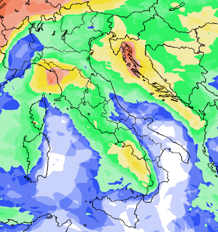 Come anticipato poco sopra, le piogge si concentreranno soprattutto lungo il versante tirrenico e le aree interne, che si troveranno esposte al flusso mite e teso da ovest. Qualche pioggia si farà vedere anche al nord, unitamente a nevicate sulle Alpi a quote piuttosto elevate. Piogge meno frequenti nelle zone sottovento al flusso occidentale, ovvero la Sardegna orientale, il medio-basso Adriatico ed il settore ionico.