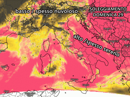 Dalla mappa seguente, è evidente come domenica l’Italia sarà letteralmente divisa in due, con il Nord sotto la copertura nuvolosa e con un ridotto soleggiamento, mentre gran parte del Sud, e del Medio-Basso Adriatico, godrà di condizioni quasi estive, con Sole e temperature relativamente miti.