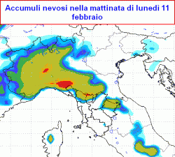 Freddo sull'insieme del Paese, neve su Romagna, medio Adriatico e a quote molto basse sull'Appennino meridionale. Dalla notte su lunedì prime nevicate sulla Liguria, Valle d'Aosta e ovest Piemonte, in estensione a Emilia e Lombardia centro-occidentale, in seguito anche a Trentino, alto Veneto e alto Friuli, sui restanti settori del nord pioggia. Neve sino a quote molto basse lunedì mattina anche sulle centrali tirreniche, specie sull'alta Toscana.
