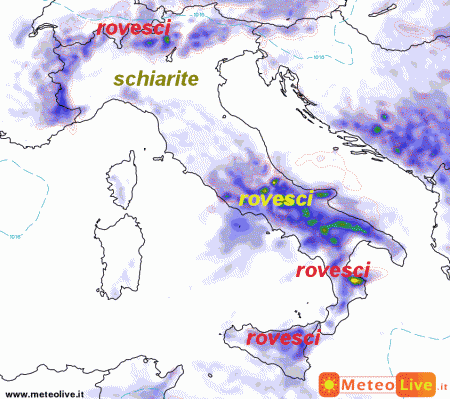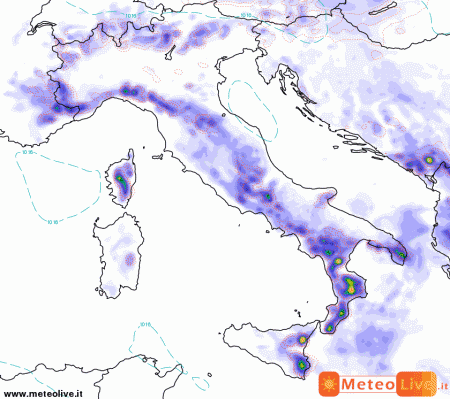 EVOLUZIONE: domenica tempo simile ma con fenomeni in spostamento dall’Appennino verso la fascia pianeggiante del Tirreno, come mostra la carta precipitativa seguente, ancora assenza di fenomeni sulle pianure del nord, probabilmente saltate le coste delle regioni adriatiche, tranne il Salento: