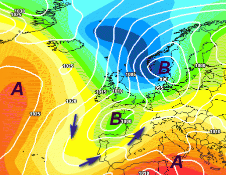 VERO PEGGIORAMENTO: non interverrà probabilmente prima di venerdì 5 o addirittura di sabato 6, poiché dipenderà dall’affondo di una saccatura in discesa dal nord Europa che dovrebbe collegarsi con la conca depressionaria che si scaverà sull’Iberia; in questo modo affluirà verso il nord e il centro del nostro Paese aria nettamente più instabile; qui sotto la potenziale carta barica del 5 giugno e subito sotto la carta delle eventuali precipitazioni:
