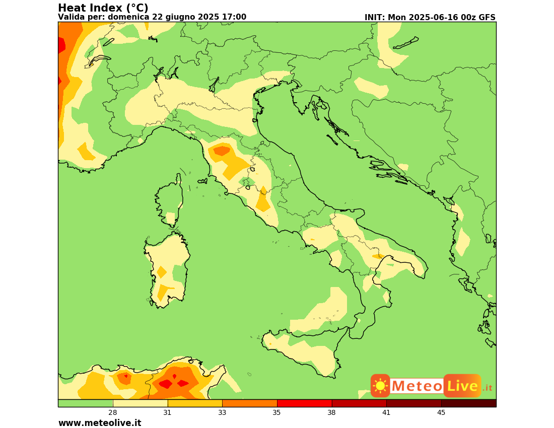 Ecco la nostra mappa del disagio da caldo previsto per domenica: