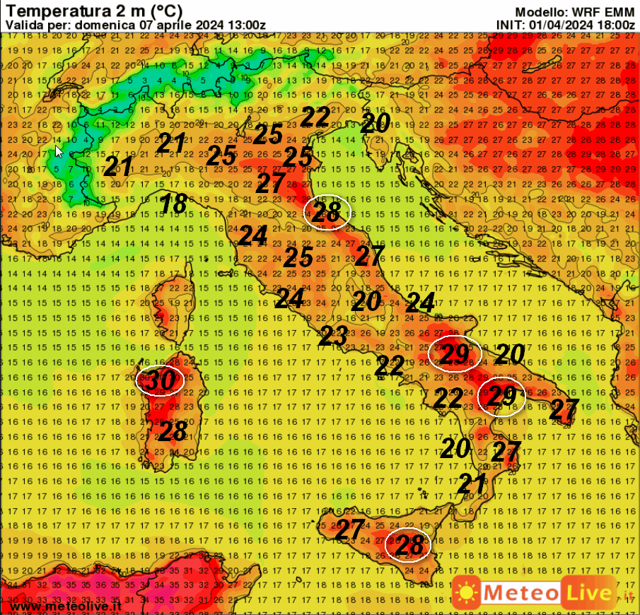 Ci sono i 30°(!) che si potrebbero toccare sul nord della Sardegna; 29° tra Puglia e Lucania, 28° in Sicilia e sulla Romagna, 27° sulla Calabria Ionica e lungo le coste delle Marche. Sul resto d’Italia temperature ben al di sopra dei 20°.