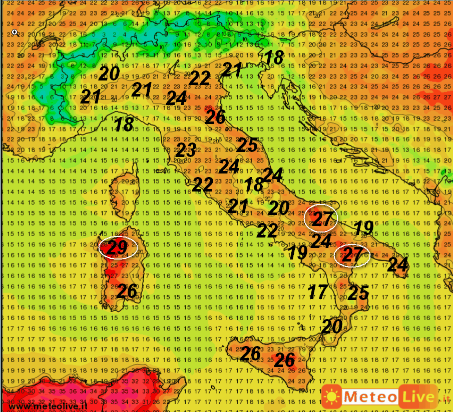 Puntiamo subito lo sguardo alle Isole e ad alcune aree del settore centro-meridionale italico. Punte di 29° sono attese sulla Sardegna settentrionale, 27° tra Puglia e Lucania, 26° su Sicilia e Romagna.