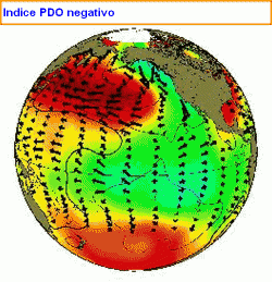 Ma allora esistono altre correlazioni che possono essere associate alla maggior frequenza dei fenomeni tornadici?. Analizzando il luogo più tornadico della Terra, le grandi pianure nord-americane, si nota una certa correlazione con l’indice oceanico PDO (Pacific Decadal Oscillation). In particolare l’andamento negativo dell’indice, che contempla acque più fredde lungo le coste pacifiche e più calde nella piscina centrale del Pacifico, risulterebbe in fase con una maggior frequenza di tornado di potenza medio-alta.