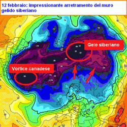 Con un Atlantico così, cari lettori, l’alta russa ha poce chances di venire a trovarci. Una massa d’aria forzata dinamicamente da un getto impetuoso ha sicuramente la meglio su un blocco d’aria inerte, frenato dal suo peso. Le correnti occidentali, che sull’Europa giungono attraverso la via atlantica, torneranno a spingere forte nella prima metà di febbraio e ricacceranno indietro di qualche migliaio di chilometri il muro del freddo russo (figura qui a fianco).