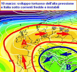 A proposito di freddo: il mancato sviluppo dell’alta pressione verso il cuore dell’Europa potrebbe tendere a deviare l’asse del bel tempo verso il Regno Unito e il mare del Nord. L’Italia pertanto, nella seconda decade di marzo, verrebbe a trovarsi sotto l’influenza delle correnti fredde settentrionali in scivolata lungo la spalla orientale dell’alta pressione.