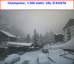 Spostandoci un poco più ad ovest, nevica alla medesima quota anche su gran parte della Val d’Aosta, specie sulla parte orientale e meridionale della regione. Qui siamo nel comprensorio sciistico di Champoluc, in Val d’Ayas.