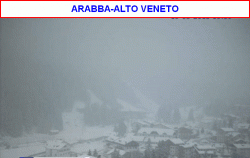 Qui siamo ad Arabba, dove al momento nevica moderatamente sotto un paesaggio tipicamente invernale.