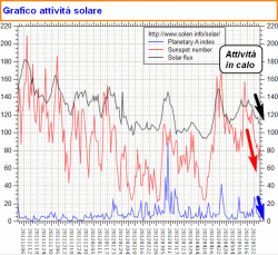 Intanto aggiorniamo la situazione allo stato attuale con il grafico sotto che ci mostra il nuovo calo a picco dei flussi energetici solari, pur con alcune macchie attive sulla sua superficie (immagine sopra).