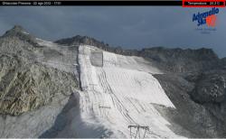 Sul ghiacciaio di Presena (nell’immagine sopra) la situazione è particolarmente pesante, con le lingue glaciali che arretrano di alcuni centimetri al giorno sotto i colpi del sole cocente. Solo i settori protetti dai teli geotessiili irescono a resistere. Qui le temperature a 3000 metri arrivano anche a 15-18 gradi durante il giorno e non scendono sotto lo zero neanche di notte. Osservate a tal proposito la rilevazione inserita in alto a destra nell’immagine: alle ore 17.01 di martedì 22 agosto la colonnina di mercurio segnava +20.3°C.